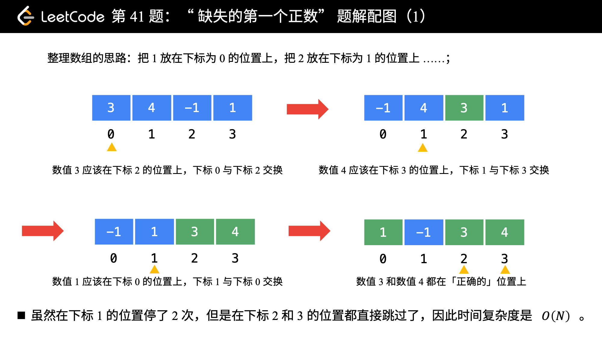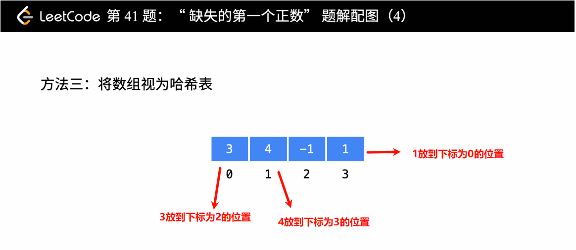 那么,我们可以采取这样的思路:就把1这个数放到下标为0的位置,2这个数放到下标为1的位置,按照这种思路整理一遍数组。然后我们再遍历一次数组,第1个遇到的它的值不等于下标的那个数,就是我们要找的缺失的第一个正数。